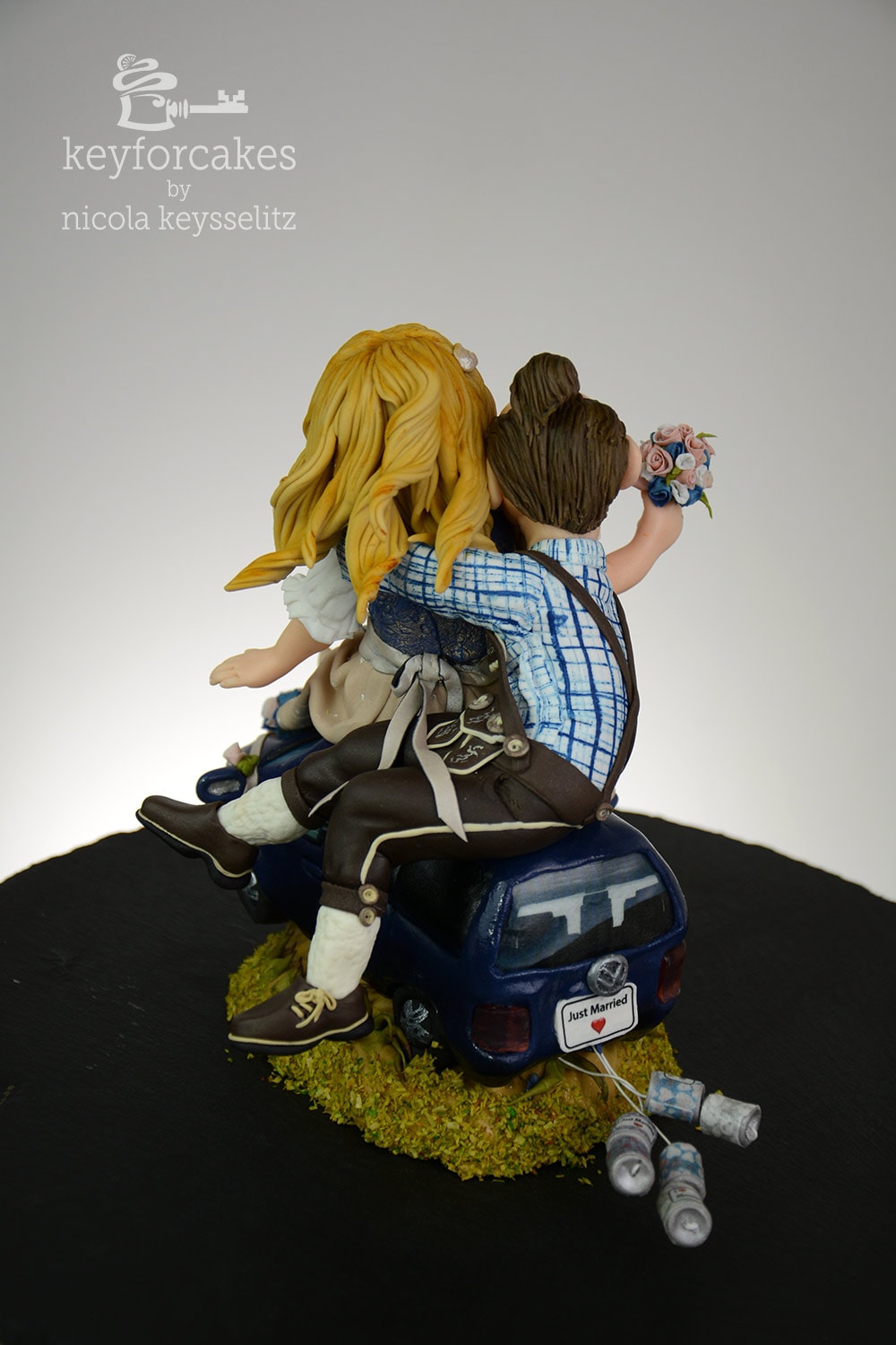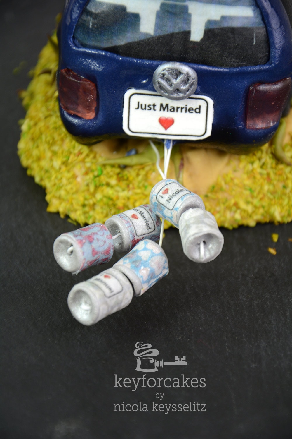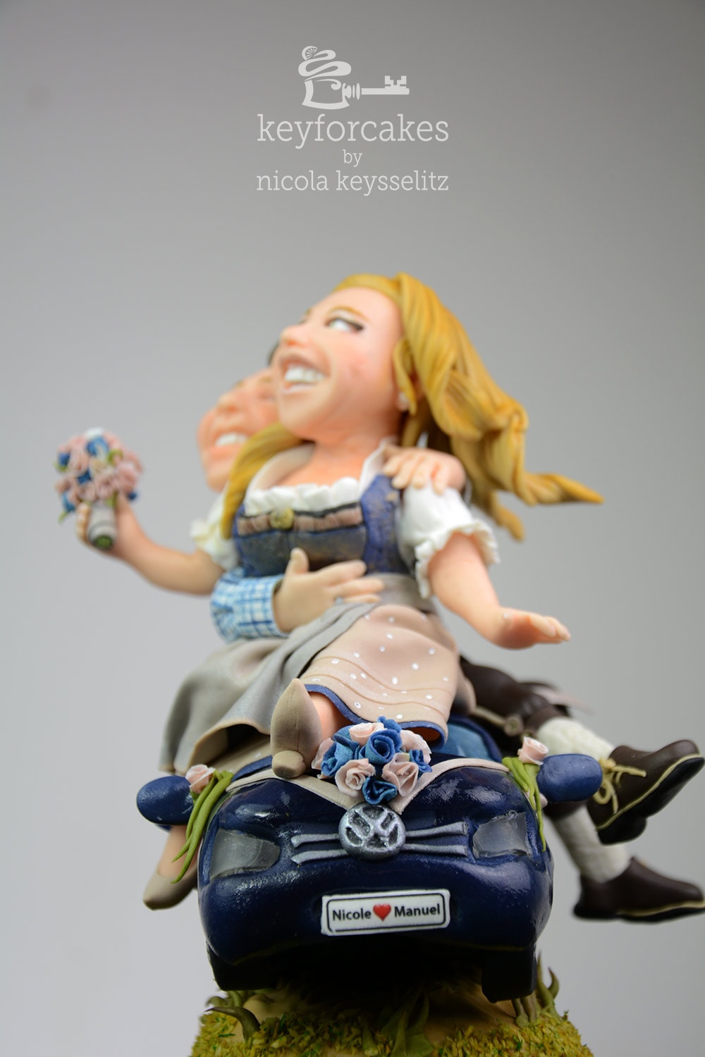 Die Arbeit hat mir extrem viel Spaß gemacht auch wenn sie technisch ganz schön kniffelig war. Es handelte sich erneut um einen Naked Cake, Nicole wollte unbedingt Ihren geliebten VW-Bus mit drauf haben, da sie damit immer wunderbare Urlaubsreisen verbringen. Das hieß dass der Bus zur eigentlichen Stütze der Figur diente.. und der Bus sollte etwas springen (was dummerweise auf den Fotos nicht ganz zur Geltung kommt).