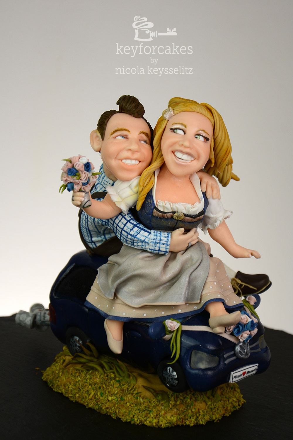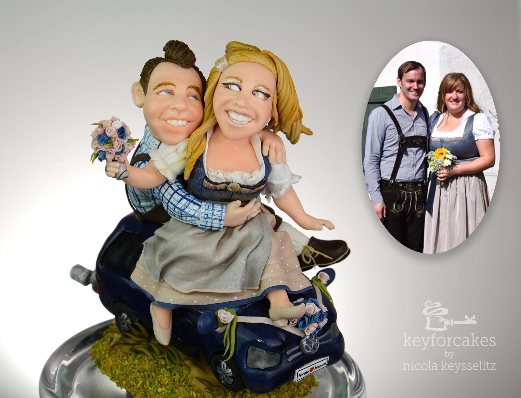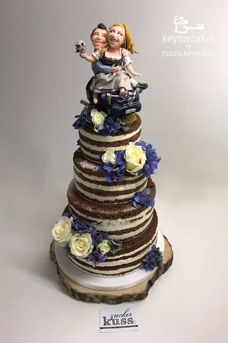 Die Arbeit hat mir extrem viel Spaß gemacht auch wenn sie technisch ganz schön kniffelig war. Es handelte sich erneut um einen Naked Cake, Nicole wollte unbedingt Ihren geliebten VW-Bus mit drauf haben, da sie damit immer wunderbare Urlaubsreisen verbringen. Das hieß dass der Bus zur eigentlichen Stütze der Figur diente.. und der Bus sollte etwas springen (was dummerweise auf den Fotos nicht ganz zur Geltung kommt).