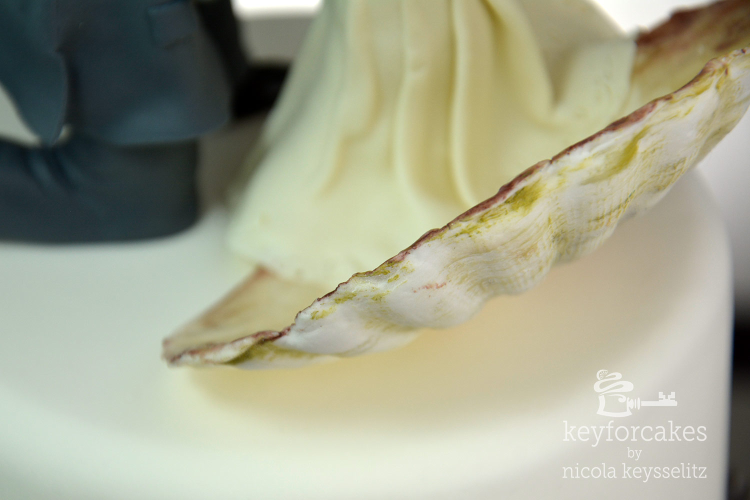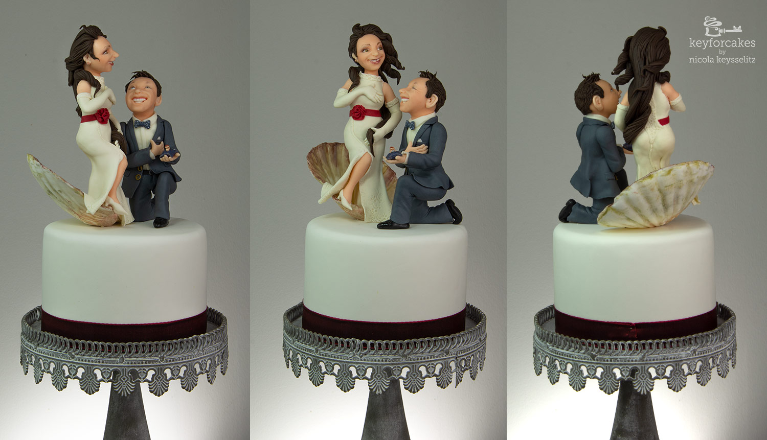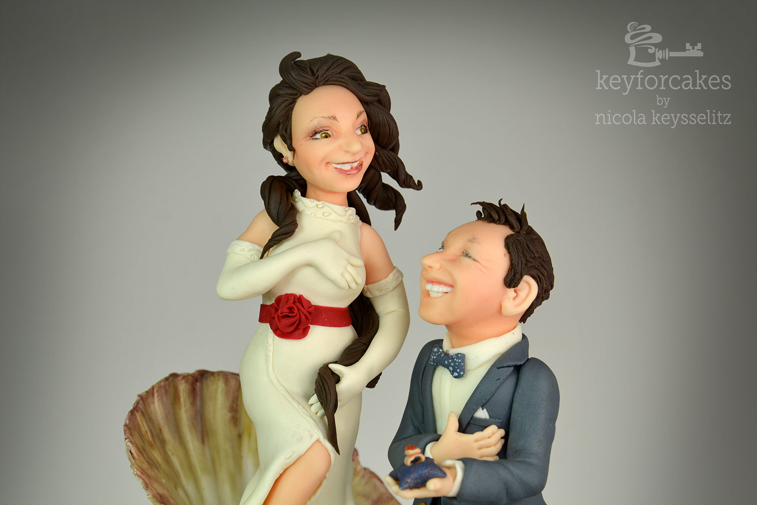 Der Bräutigam auf Knien mir dem besonderen Ring war ein ausdrücklicher Wunsch. Aber das alles, also Venusmuschel wie auf dem Gemälde samt Braut und den knienden Bräutigam auf dem kleinen Tortentopper von 15cm Durchmesse zu bekommen war gar nicht so einfach. Darum entschied ich mich die Muschel etwas aufzustellen, das sparte mir Platz und ich fand es in der Gesamtgestaltung Attraktiver.