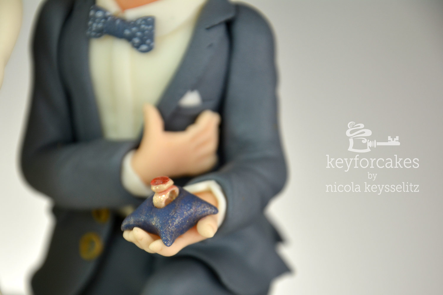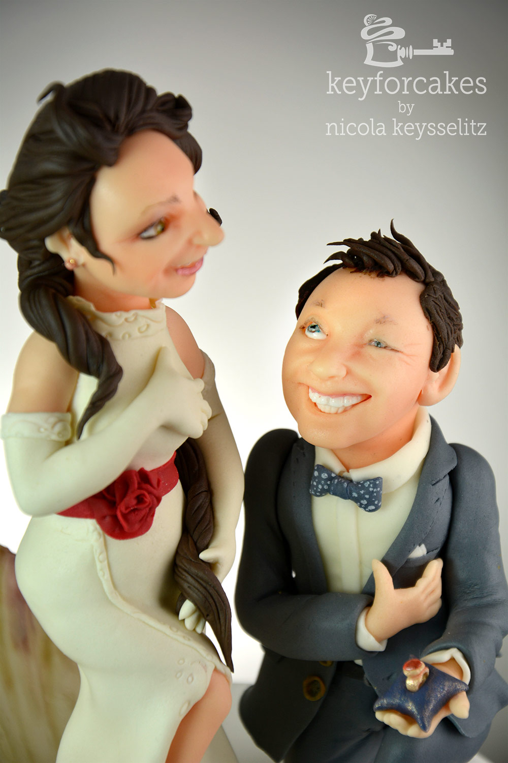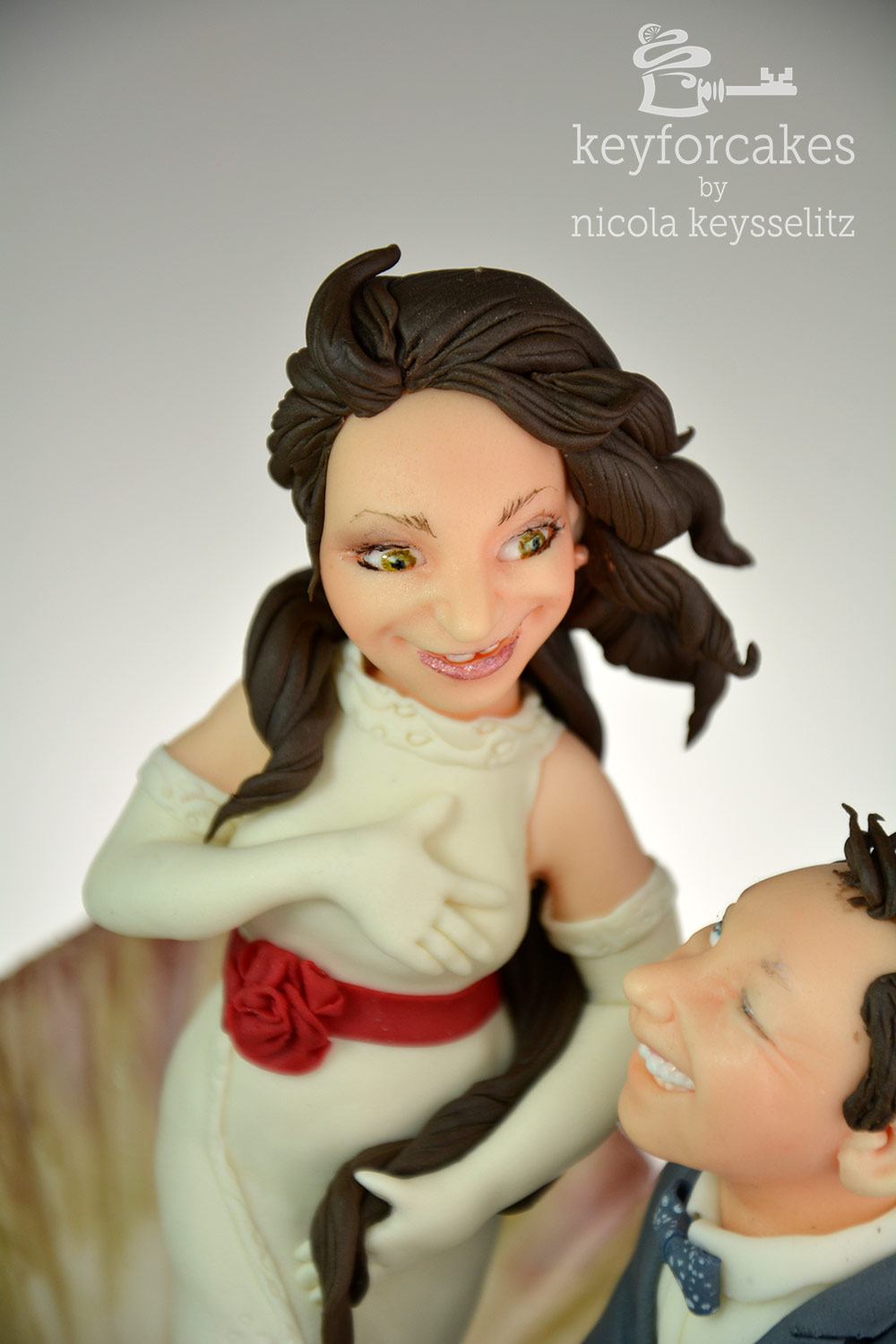 Der Bräutigam auf Knien mir dem besonderen Ring war ein ausdrücklicher Wunsch. Aber das alles, also Venusmuschel wie auf dem Gemälde samt Braut und den knienden Bräutigam auf dem kleinen Tortentopper von 15cm Durchmesse zu bekommen war gar nicht so einfach. Darum entschied ich mich die Muschel etwas aufzustellen, das sparte mir Platz und ich fand es in der Gesamtgestaltung Attraktiver.