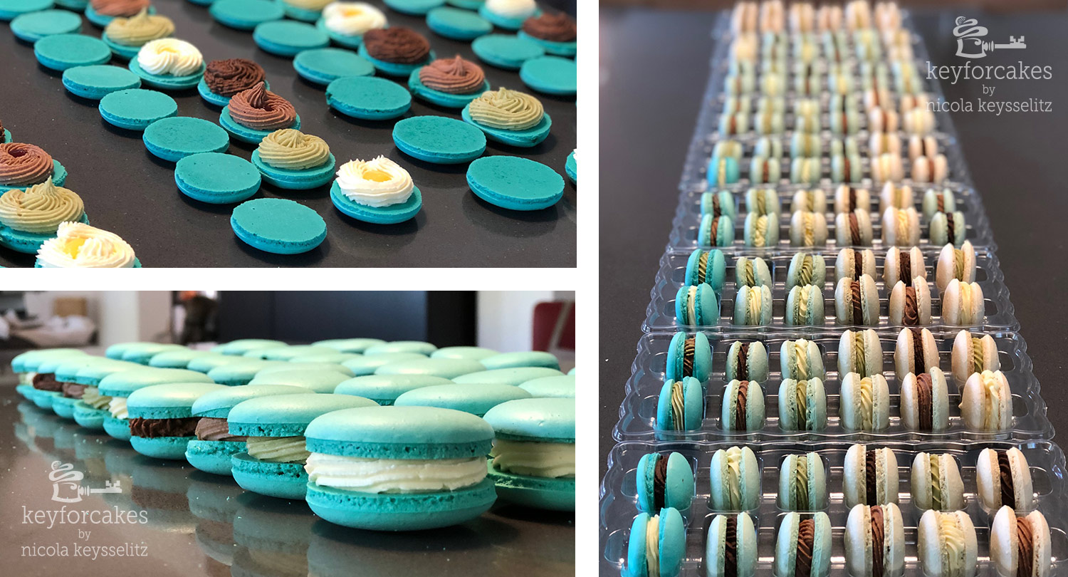 Anstatt direkt von München nach Ibiza zu fliegen, machte ich davor einen Abstecher nach Madrid (über viele Jahre mein Wahlheimat), besuchte meinen Enkel  und gab mich dann in meiner Madrider Küche den Hochzeitsvorbereitungen hin. Eine Styropor-box die den Handgepäcks-angaben von Iberia entsprach  hatte ich vor Ort und somit sollte den Vorbereitungen  nichts mehr im Wege stehen.  Mit dem Farbverlauf stand ich anfangs etwas auf dem Kriegsfuß, denn man sollte die Macaron-masse niemals nachfärben. Hört auf diesen Rat, es geht einfach nur schief… aber egal. Auch wenn ich durch diverse Fehler eine leichte „Überproduktion“ hatte (sehr zu Freuden meiner Tochter) verpackte ich die zunächst eingefrorenen gelungenen 180 Macarons fachgerecht in die Styropor-box und machte mich auf den Weg zum Flughafen. (Ein Glück machte mich meine Tochter noch darauf aufmerksam dass die Eis-Packs „Flüssigkeit“ enthalten und nicht im Handgepäck erlaubt sind. Also wanderten diese direkt in den Koffer für den späteren Einsatz vor Ort.)