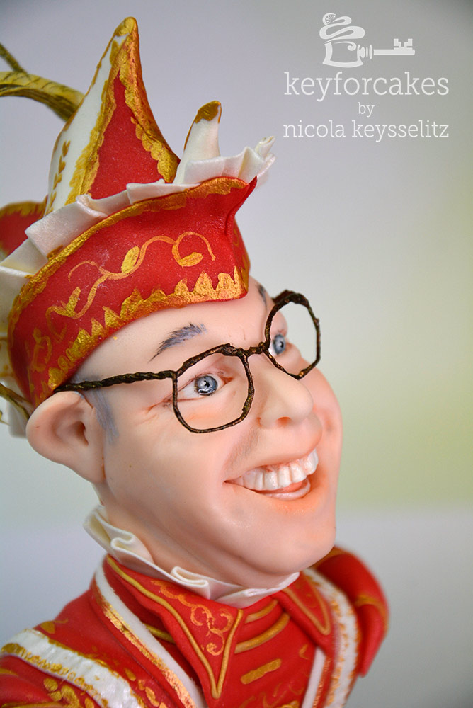 Manchmal reichen kleine Büsten aus um einer Torte die gewünschte persönliche Note zu geben. Bei diesem Auftrag hatte ich viel Spaß, auch wenn die vielen Dekorationen des Kostüms doch mehr Arbeit war als geplant, aber ich bin mit dem Ergebnis sehr zufrieden, und wie ich erhahren habe hatte der Prinz große Freude an der Torte.